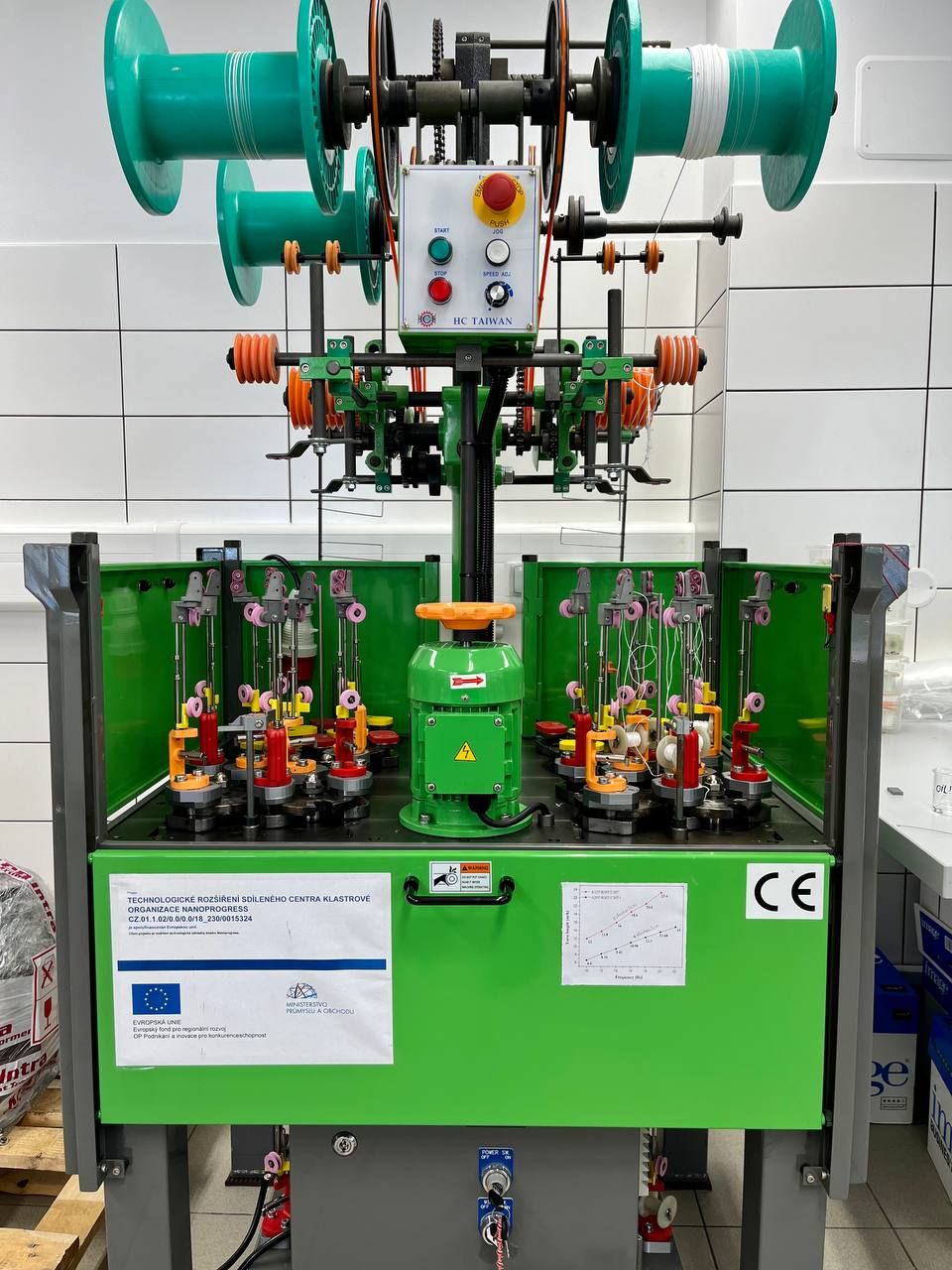 Paličkovací / splétací stroj (braiding machine) RA-8-4, výrobce HC Taiwan. Paličkovací stroj proplétá čtyři nebo osm přízí/nití do splétané příze/niti a vytváří tak různé materiály včetně oplétání centrální niti/příze v tak zvané dužině. Zařízení bylo pořízeno jako investice pro řešení projektů klastru NANOPROGRESS a je majetkem NANOPROGRESS z.s. Zařízení slouží zejména k vývoji nanovlákenných nití pro biologické a medicínské aplikace.