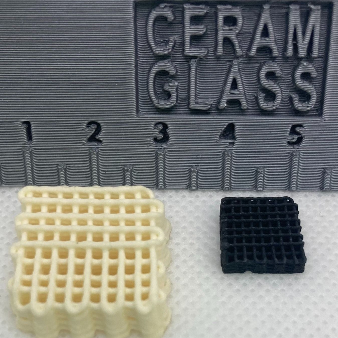 Mřížka smetanové barvy vznikla přímým inkoustovým tiskem (DIW), kdy se po 3D-tisku scaffold následně vytvrzuje v peci a vzniká plně vytvrzený materiál, který po vypálení změní barvu i velikost. To se stane také s červeným gyroidem vytištěným technikou maskované stereolitografie (mSLA).
